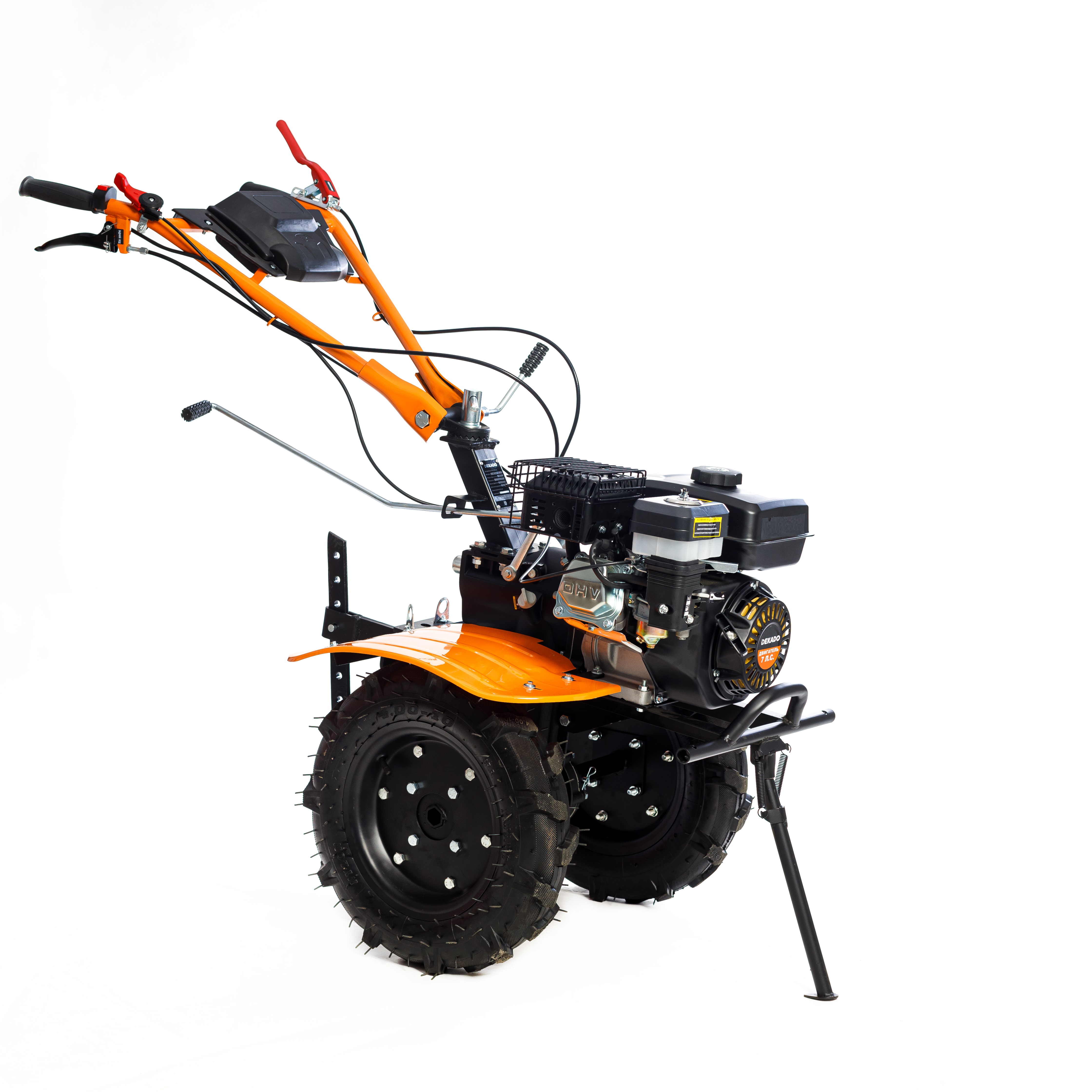 На мотоблоке устанавливается современный 4-хтактный бензиновый двигатель и надежный шестеренчато-цепной маслонаполненный редуктор в чугунном корпусе. Редуктор оснащен механизмами переключения передач и разблокировки левого вала. Рулевая колонка имеет широкие диапазоны регулировки в двух плоскостях и дает возможность обрабатывать почву вдоль заборов и ограждений.