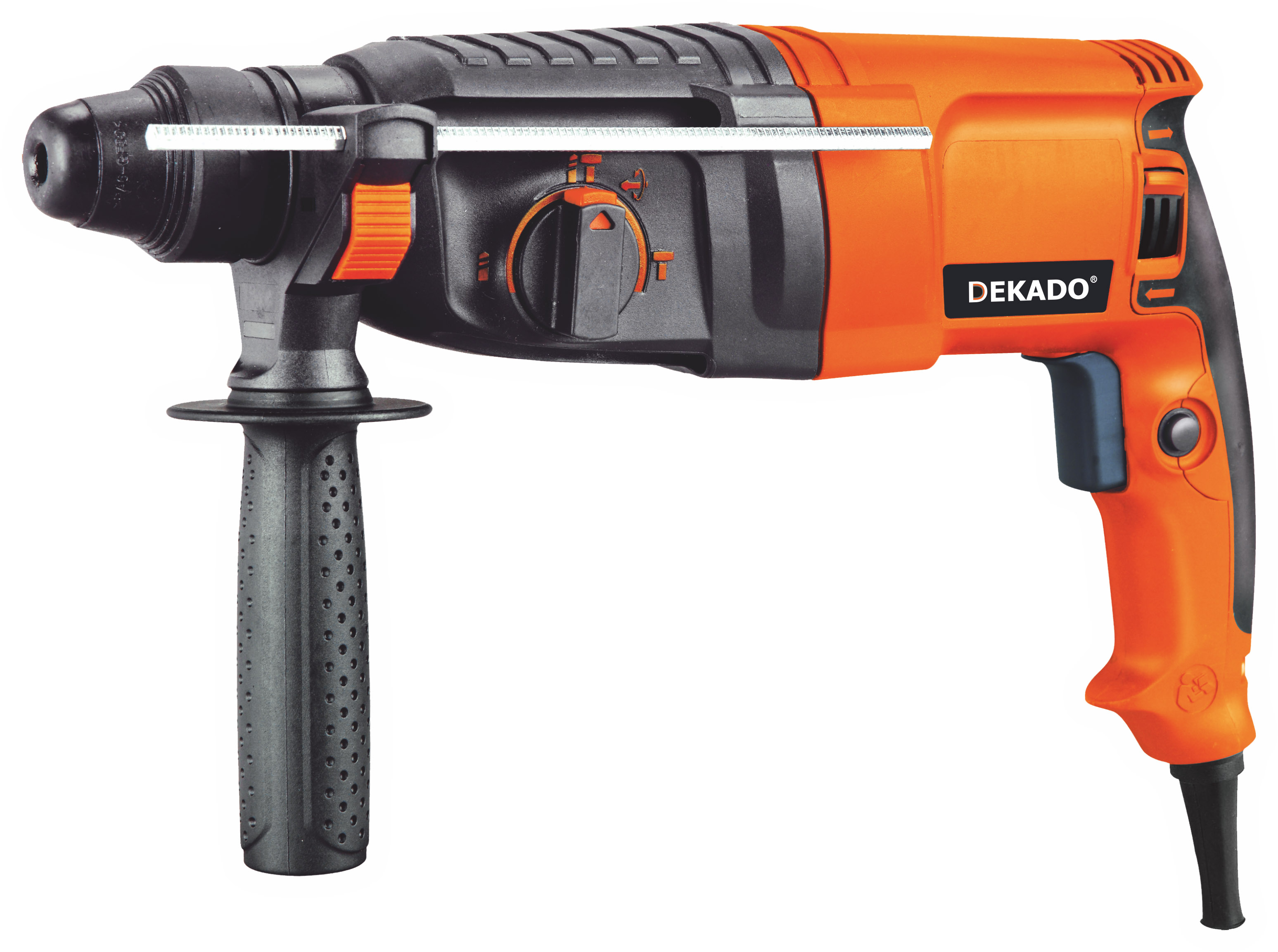 Перфоратор ударный П800 DEKADO относится к изделиям бытового назначения и предназначен для бурения отверстий в бетоне и камне, а также для разрушения кирпичной кладки, пробивания штроб и борозд в бетоне, камне, кирпиче и сверления отверстий в различных конструкционных материалах. Номинальная потребляемая мощность 800 Вт. Наибольший диаметр сверления в бетоне 26 мм. Перфоратор П800 DEKADO работает в трех режимах: вращательном, ударно-вращательном, ударном.