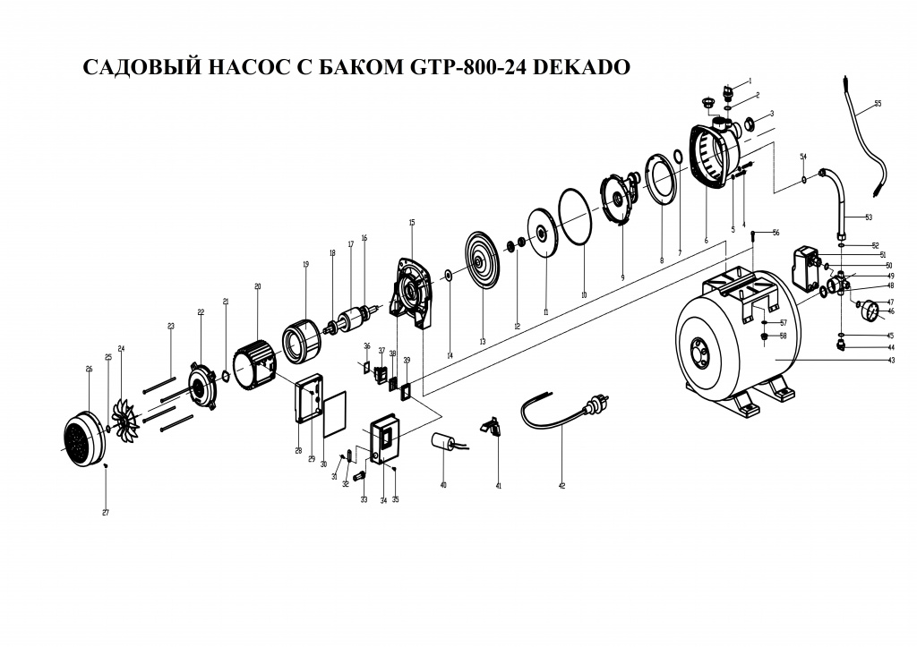 28-35 Корпус конденсатора (пластик) 36-39 Выключатель 40 Конденсатор 12 мкф 41 Крепление конденсатора 42 Сетевой кабель с вилкой 43 Гидроаккумулятор (бак) 43.1 Мембрана бак 24 л 43.2 Фланец гидроаккумулятора 44 Пробка (заглушка) с кольцом 46 Манометр 48 Прокладка 49 Коннектор (пятипозиционный) 51 Реле давления 53 Шланг подающий 55 Элетрический провод 56-58 Винт крепления электромотора |