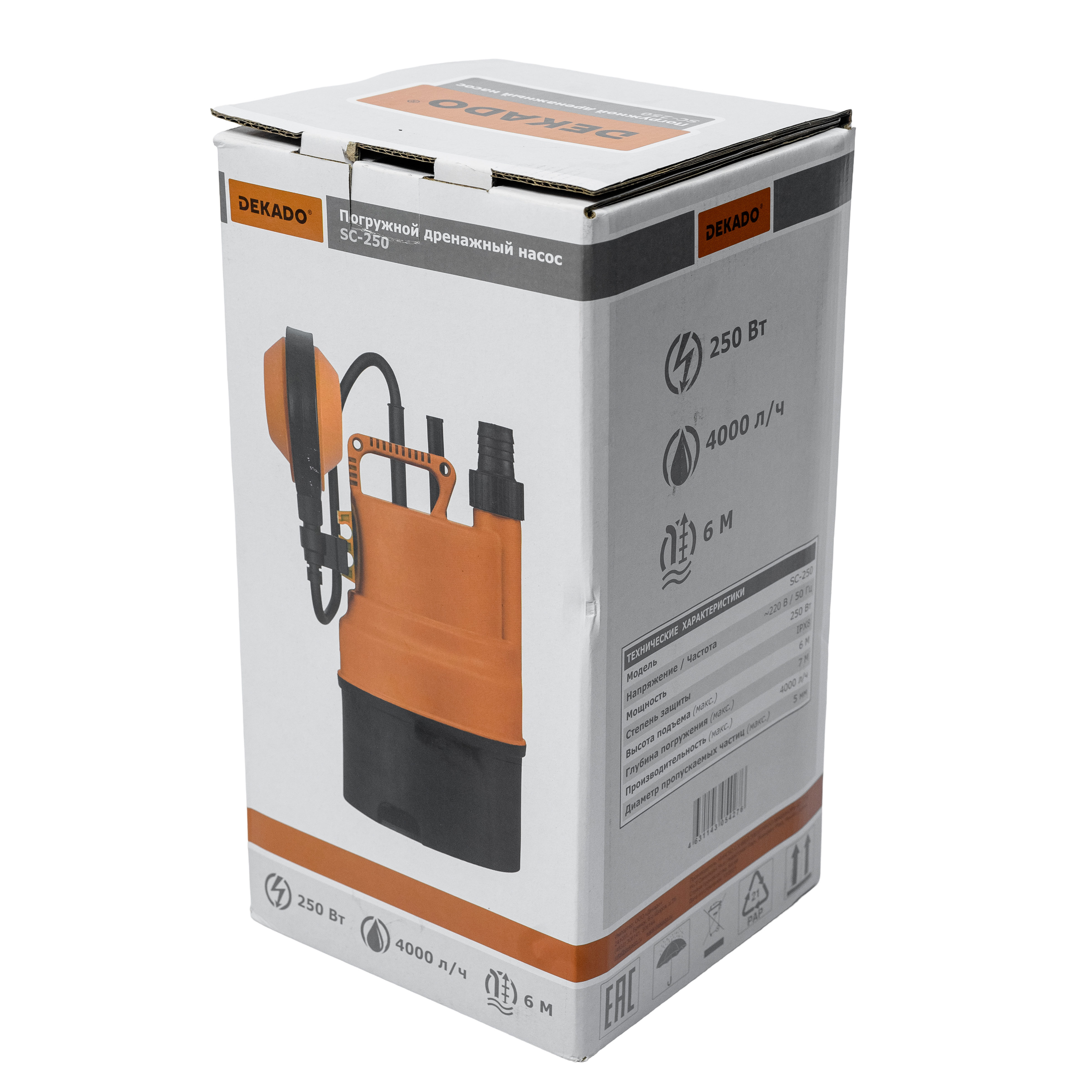 Инструкция по эксплуатацииПогружной дренажный насос для чистой воды SС-250 DEKADO предназначен для отведения дренажных, дождевых, грунтовых, талых и сточных вод из дренажных, коллекторных и фильтрационных колодцев, садовых прудов, сточных канав, бассейнов, затопленных подвалов и шахт, как в ручном, так и в автоматическом режиме. Допустимый диаметр пропускаемых твердых частиц для модели SС-250 DEKADO - 5 мм.