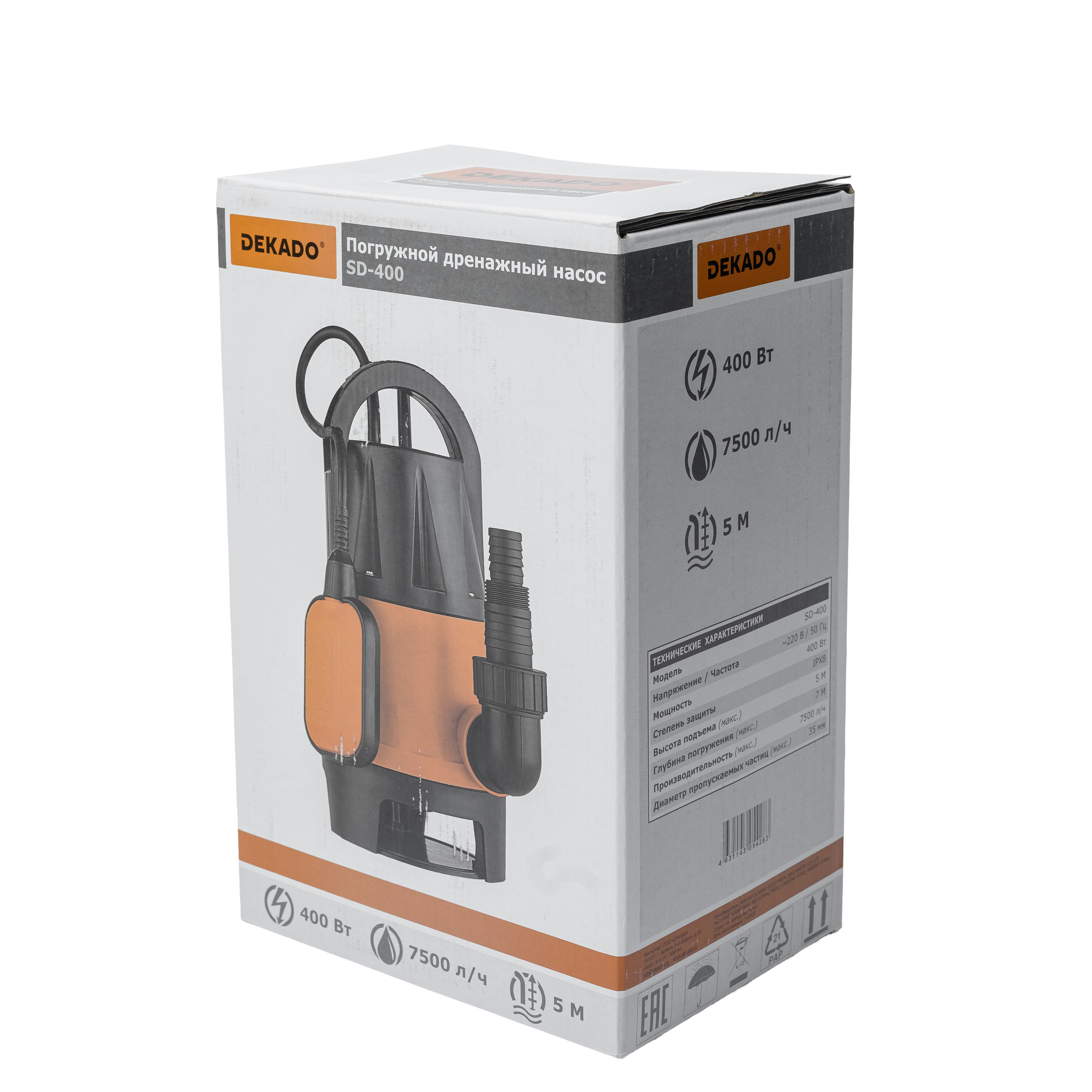 Кроме того, насос может применяться для орошения садов и огородов, подачи воды из колодцев, открытых водоемов и источников. SD-400 DEKADO имеет металлический вал электродвигателя с алюминиевой обмоткой заключенный в корпус из пластика. Насос предназначен только для бытового использования.