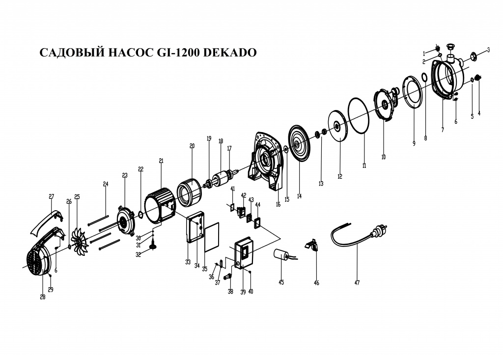 Инструкция по эксплуатацииПоверхностный (садовый) насос GI-1200 DEKADO при эксплуатации не погружается в перекачиваемую жидкую среду – его располагают на поверхности земли, в непосредственной близости от источника водоснабжения. Чаще всего насосные устройства данного типа используют для работ с дождевой, пресной водопроводной, а также содержащей хлор водой из бассейна, откачивания воды из колодезных источников, так как глубина, с которой они могут эффективно откачивать жидкую среду, составляет не более 7 метров. Насос садовый GI-1200 DEKADO предназначен для осушения затопленных мест, перекачки, забора воды из колодцев и скважин, повышения давления в системах водоснабжения. Поверхностным насосом GI-1200 DEKADO можно перекачивать только воду не имеющую механических примесей. Насос предназначен только для бытового использования.