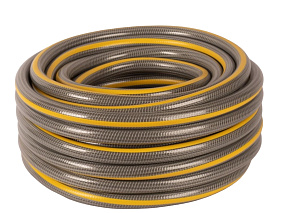 Трехслойный, армированный высокопрочной синтетической нитью шланг для полива, перекачки и прочих работ с жидкостями. Внутренний слой ПВХ непрозрачный, серый, защищает от проникновения солнечных лучей и препятствует образованию водорослей внутри тела шланга. Наружный слой ПВХ прозрачный, неокрашенный, имеет одну желтую продольную полосу вдоль тела шланга, а также специальные защитные добавки от воздействия внешних факторов, таких как ультрафиолетовое излучение, истирание. Между внутренним и наружным слоями ПВХ проложен высокопрочный плетеный корд из синтетической нити. Благодаря повышенным качественным показателям, в том числе более плотным армированием, этот вид шланга обладает более высокими эксплуатационными характеристиками: не заламывается, и не перегибается. Не содержит вредных веществ (Cd, Ba, Pb). Выдерживает давление до 24 бар. Рабочая температура от -5°С до +40°С. Благодаря высоким качественным показателям этот вид шланга имеет высокие эксплуатационные характеристики!