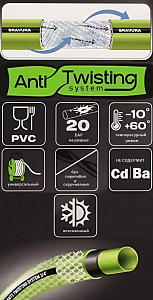 Шланг армирован по технологии ANTI TWISTING SYSTEM, которая препятствует вращению шланга под давлением, позволяет сохранять устойчивость формы, обеспечивая постоянный поток и исключая неудобства, связанные с перегибами шланга. Благодаря данной технологии достигается удобство и комфорт эксплуатации и хранения.