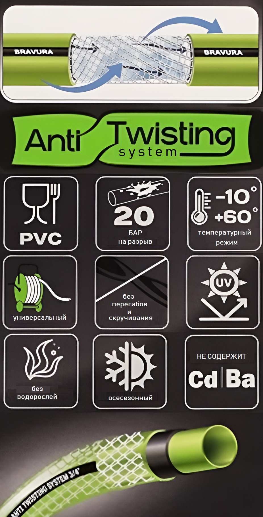 Шланг армирован по технологии ANTI TWISTING SYSTEM, которая препятствует вращению шланга под давлением, позволяет сохранять устойчивость формы, обеспечивая постоянный поток и исключая неудобства, связанные с перегибами шланга. Благодаря данной технологии достигается удобство и комфорт эксплуатации и хранения.