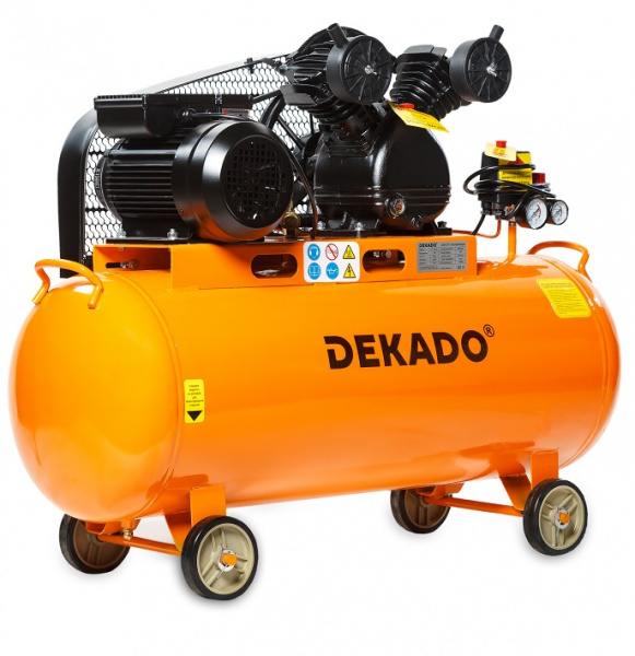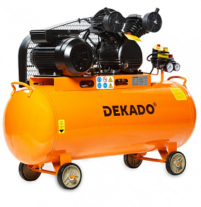 Компрессор воздушный поршневой масляный с ременным приводом KР-100/600В DEKADO, предназначен для выработки сжатого воздуха. Используется совместно с пистолетами для продувки, краскораспылителями, пневмовинтовертами, отбойными молотками, кузовными пилами, пистолетами для подкачки шин и другими инструментами пневматического типа. Ресивер объемом 100 литров позволяет накапливать сжатый воздух, что ведет к сокращению рабочих циклов и замедляет изнашивание. Тем самым обеспечивает возможность продолжительной работы с высокой эффективностью. Ременная система компрессора закрыта специальным решетчатым кожухом. Все элементы контроля (манометры) и управления расположены в одном месте для удобства эксплуатации компрессора. Компрессор КР-100/600В DEKADO имеет производительность 600 л. / мин, с максимальным рабочим давлением 10 бар. Обмотка двигателя данного компрессора – медная. Оснащен блоком управления электродвигателем.