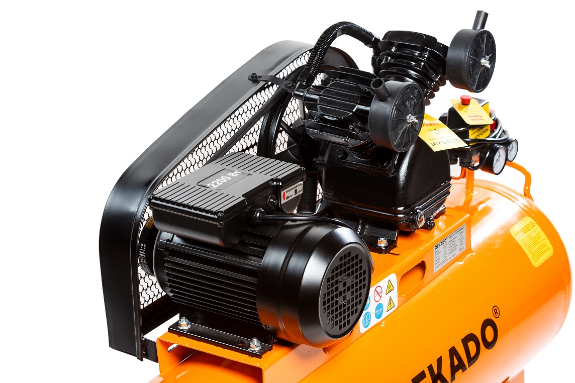 Компрессор воздушный поршневой масляный с ременным приводом KР-100/450В DEKADO, предназначен для выработки сжатого воздуха. Используется совместно с пистолетами для продувки, краскораспылителями, пневмовинтовертами, отбойными молотками, кузовными пилами, пистолетами для подкачки шин и другими инструментами пневматического типа. Ресивер объемом 100 литров позволяет накапливать сжатый воздух, что ведет к сокращению рабочих циклов и замедляет изнашивание. Тем самым обеспечивает возможность продолжительной работы с высокой эффективностью. Ременная система компрессора закрыта специальным решетчатым кожухом. Все элементы контроля (манометры) и управления расположены в одном месте для удобства эксплуатации компрессора. Компрессор КР-100/450В DEKADO имеет производительность 450 л. / мин, с максимальным рабочим давлением 12.5 бар. Обмотка двигателя данного компрессора – медная. Оснащен блоком управления электродвигателем.