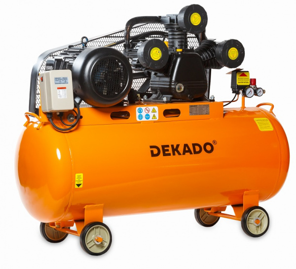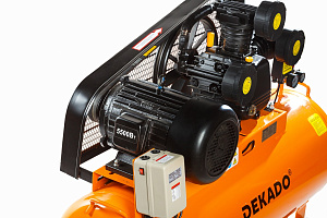 Компрессор воздушный поршневой масляный с ременным приводом KР-200/850Т DEKADO, предназначен для выработки сжатого воздуха. Используется совместно с пистолетами для продувки, краскораспылителями, пневмовинтовертами, отбойными молотками, кузовными пилами, пистолетами для подкачки шин и другими инструментами пневматического типа. Ресивер объемом 200 литров позволяет накапливать сжатый воздух, что ведет к сокращению рабочих циклов и замедляет изнашивание. Тем самым обеспечивает возможность продолжительной работы с высокой эффективностью. Ременная система компрессора закрыта специальным решетчатым кожухом. Все элементы контроля (манометры) и управления расположены в одном месте для удобства эксплуатации компрессора. Компрессор КР-200/850Т DEKADO имеет производительность 815 л. / мин, с максимальным рабочим давлением 8 бар. Обмотка двигателя данного компрессора – медная. Оснащен блоком управления электродвигателем.