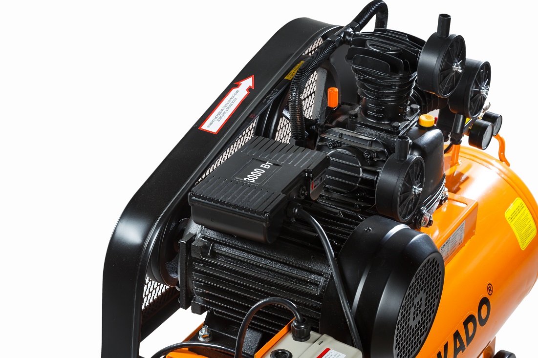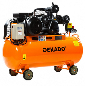 Компрессор воздушный поршневой масляный с ременным приводом KР-100/550 DEKADO, предназначен для выработки сжатого воздуха. Используется совместно с пистолетами для продувки, краскораспылителями, пневмовинтовертами, отбойными молотками, кузовными пилами, пистолетами для подкачки шин и другими инструментами пневматического типа. Ресивер объемом 100 литров позволяет накапливать сжатый воздух, что ведет к сокращению рабочих циклов и замедляет изнашивание. Тем самым обеспечивает возможность продолжительной работы с высокой эффективностью. Ременная система компрессора закрыта специальным решетчатым кожухом. Все элементы контроля (манометры) и управления расположены в одном месте для удобства эксплуатации компрессора. Компрессор КР-100/550 DEKADO имеет производительность 525 л. / мин, с максимальным рабочим давлением 8 бар. Обмотка двигателя данного компрессора – медная. Оснащен блоком управления электродвигателем.