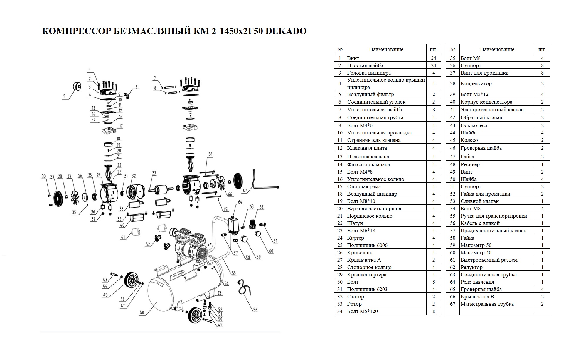Предназначен для получения сжатого воздуха и снабжения им различных пневмопотребителей. Благодаря отсутствию масла в механизме, безмасляный компрессор обеспечивает высокое качество сжатого воздуха. Агрегат не предназначен для промышленного использования, строительных работ и коммерческого использования. Компрессор КМ 2-1450х2F50 DEKADO обеспечивает надежную и безопасную работу.
